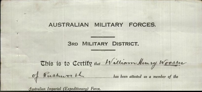 Portrait of William Henry Wooster taken around 23rd April 1916. This is one of a series of photographs taken by the Darge Photographic Company which had the concession to take photographs at the Broadmeadows and Seymour army camps during the First World War. In the 1930's, the Australian War Memorial purchased the original glass negatives from Algernon Darge, along with the photographers' notebooks. The notebooks contain brief details, usually a surname or unit name, for each negative. The names are transcribed as they appear in the notebooks.